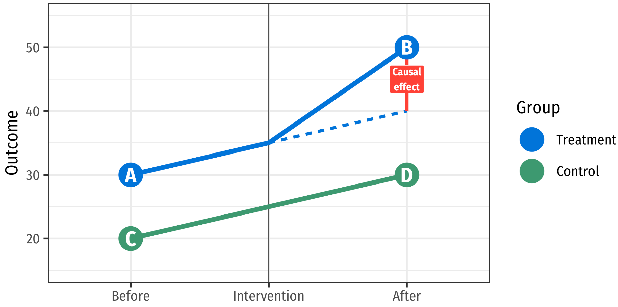 \[ \widehat{ATT} = \underbrace{[\text{Mean}(B) - \text{Mean}(A)]}_\text{Difference} - \underbrace{[\text{Mean}(D) - \text{Mean}(C)]}_\text{Difference} \]