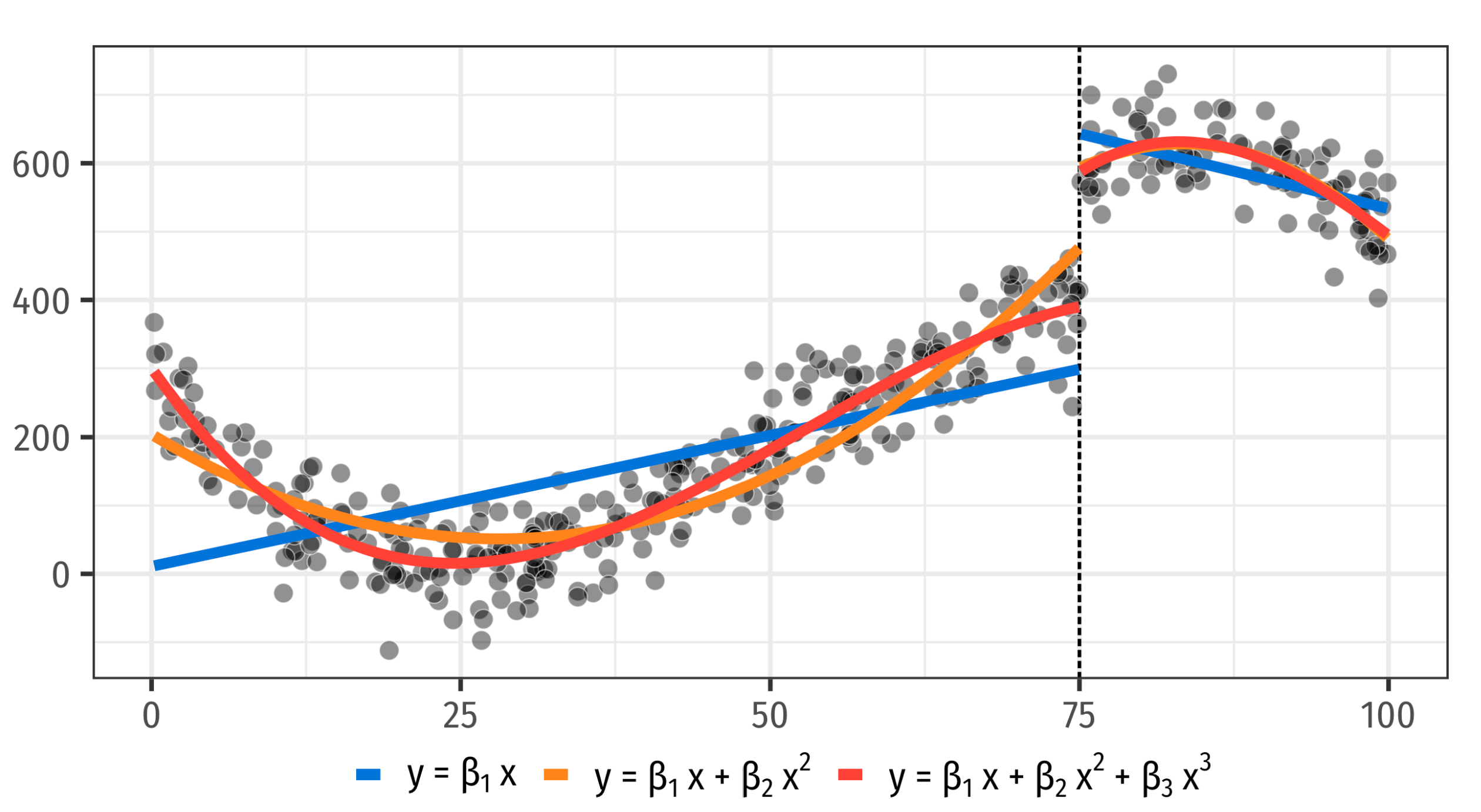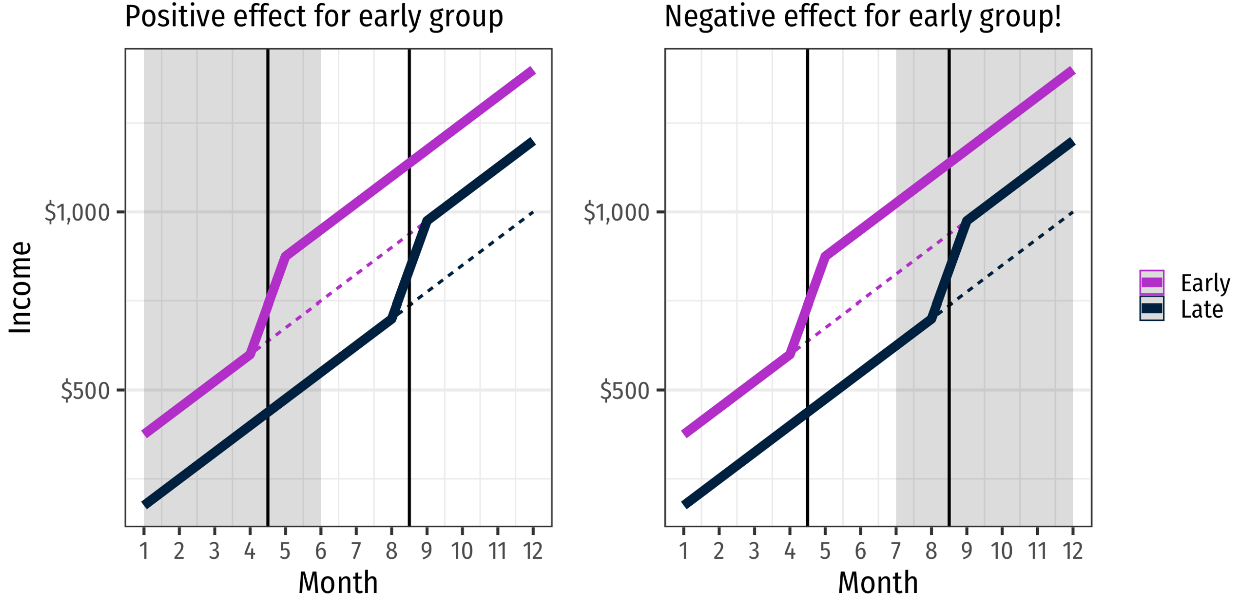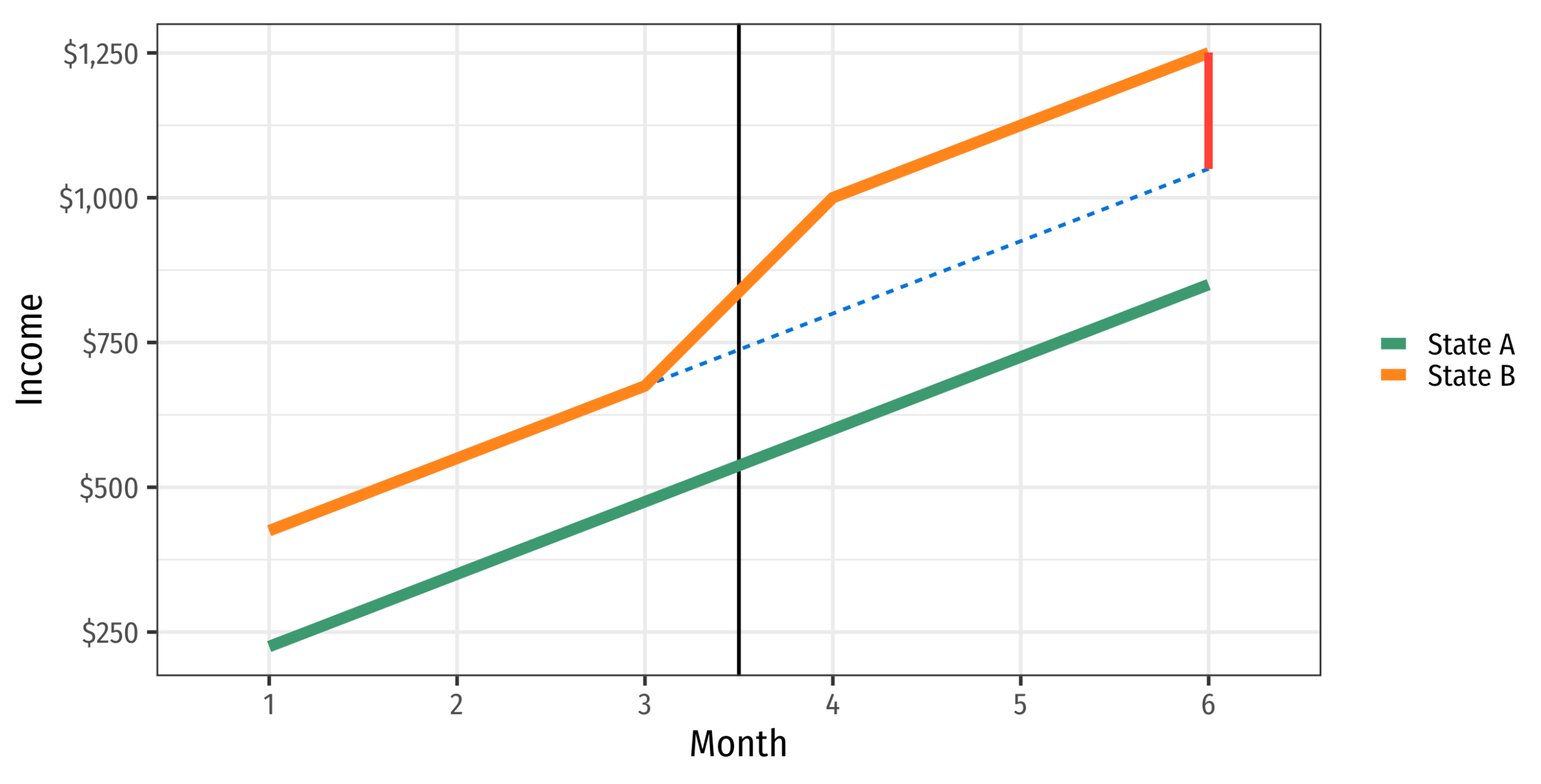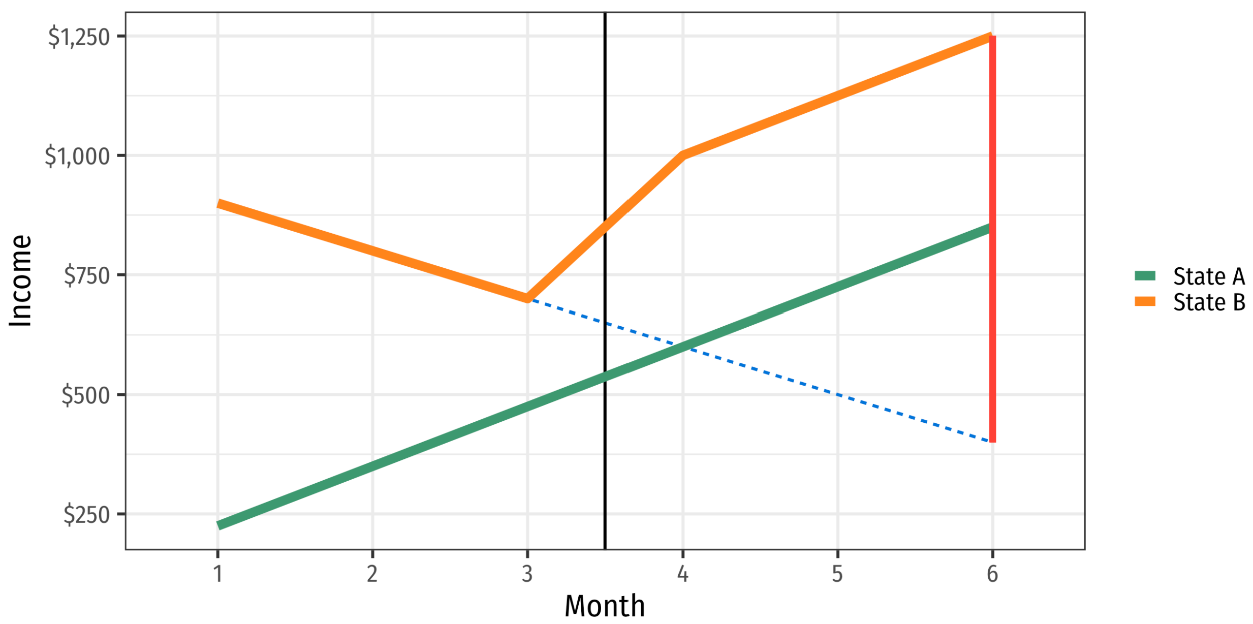 \[ \begin{align} Y = & \beta_0 + \beta_1 \text{Treated} + \beta_2 \text{Post-treatment} + \\ & \color{purple}{\beta_3 \text{Treated} \times \text{Post-treatment}} + \varepsilon \end{align} \]