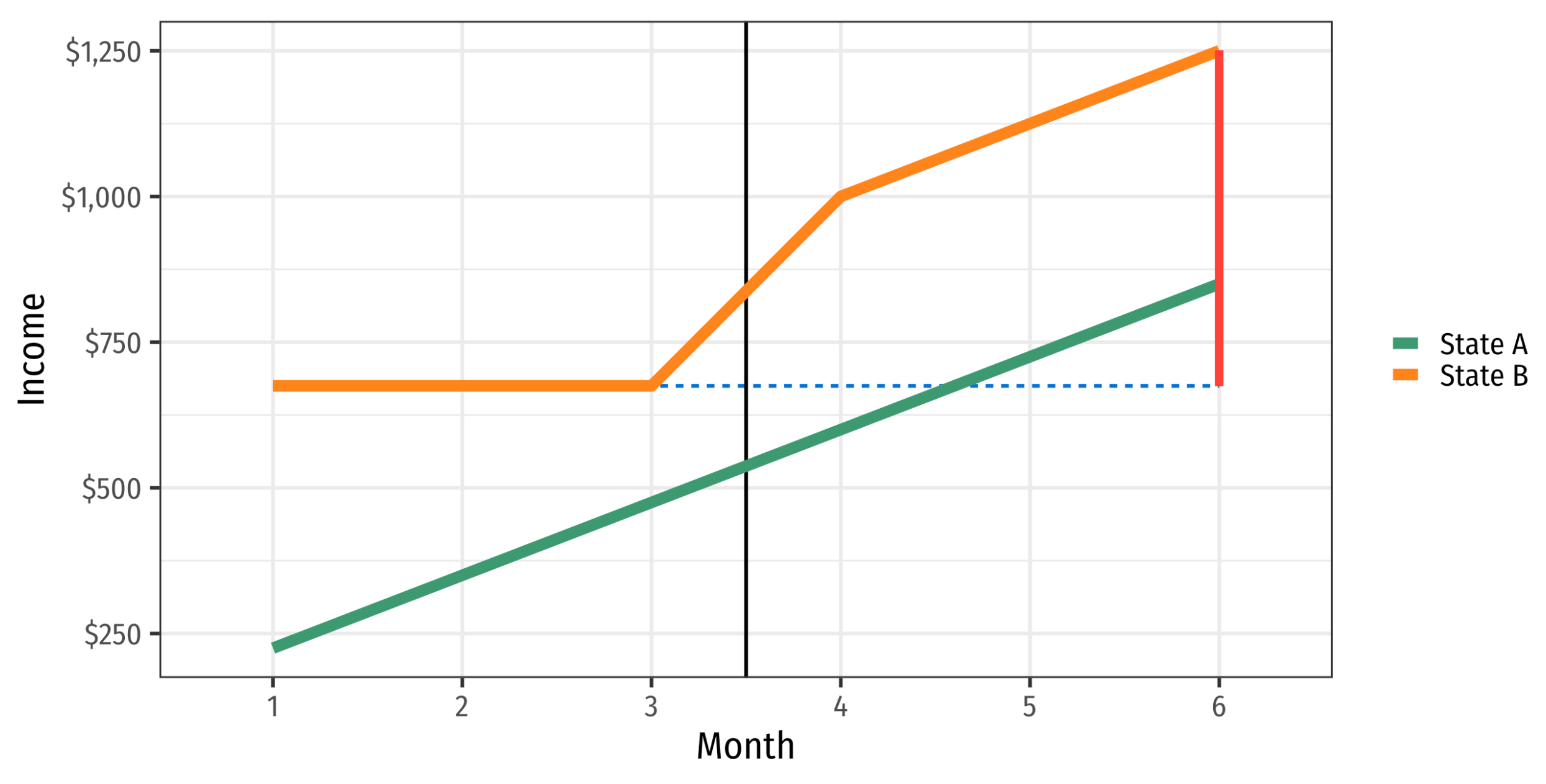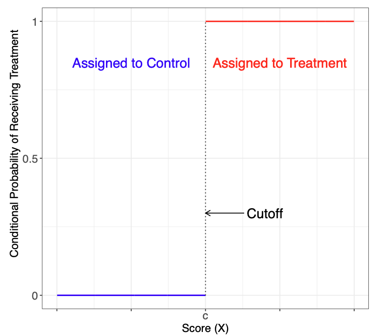 \[ Y_i = (1 - T_i) Y_i(0) + T_i Y_i(1) = \begin{cases} Y_i(0) & \text{if } X_i < c\\ Y_i(1) & \text{if } X_i \geq c \end{cases} \]