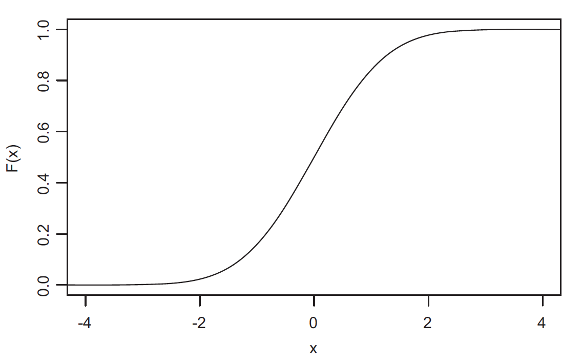 \[ F(x) = Pr[X \leq x] = \int_{-\infty}^x f(u)du \]
