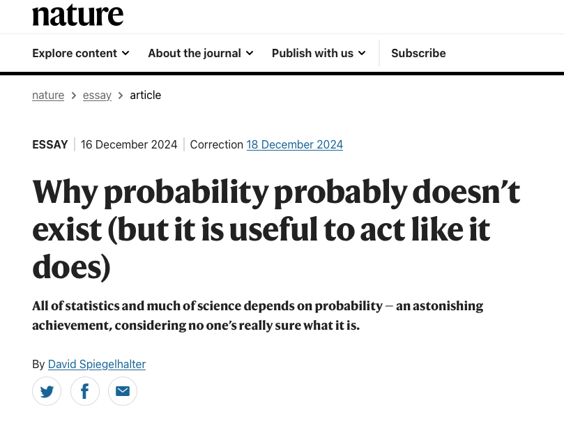 And yet, any numerical probability… is not an objective property of the world, but a construction based on personal or collective judgements and (often doubtful) assumptions. Furthermore, in most circumstances, it is not even estimating some underlying ‘true’ quantity. Probability, indeed, can only rarely be said to ‘exist’ at all.