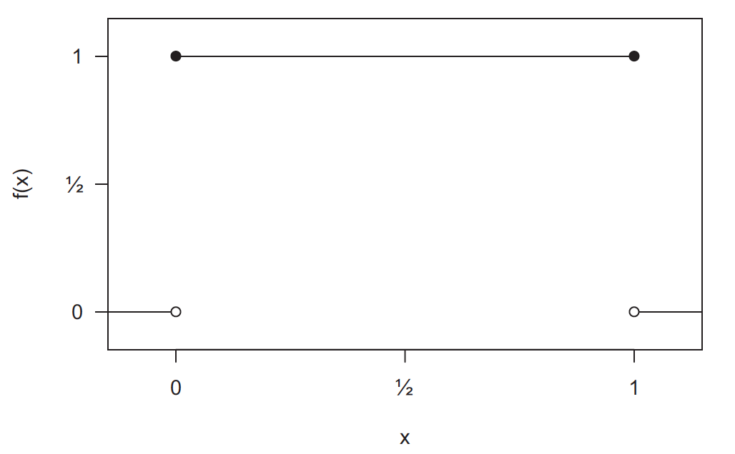 \[ f(x) =\begin{cases} 1-p & \colon & x = 0 \\ p & : & x = 1 \\ 0 & : & \text{otherwise} \end{cases} \]