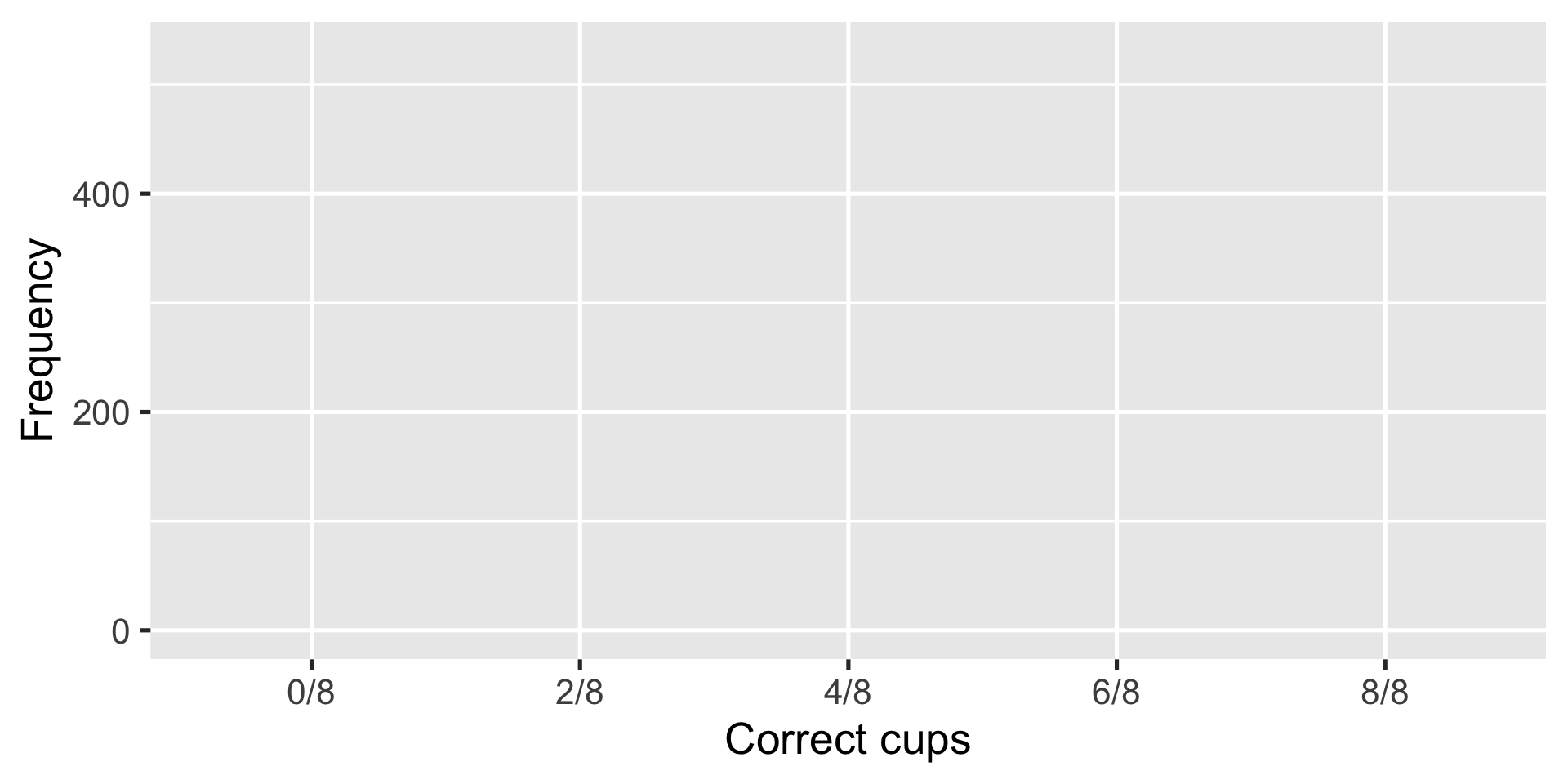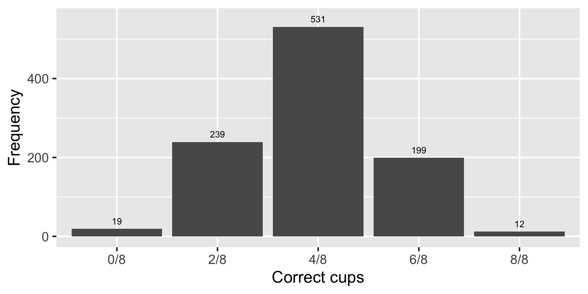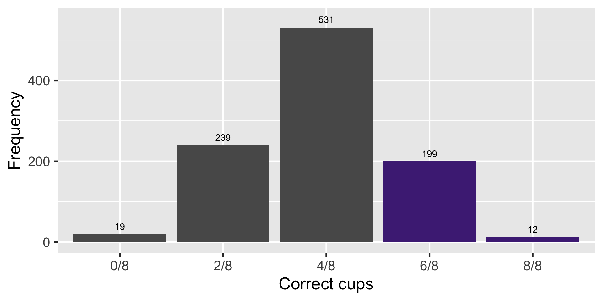 Random guesser gets at least 6/8 cups right \(\frac{(199+12)}{1000} \approx 0.21\) of the time