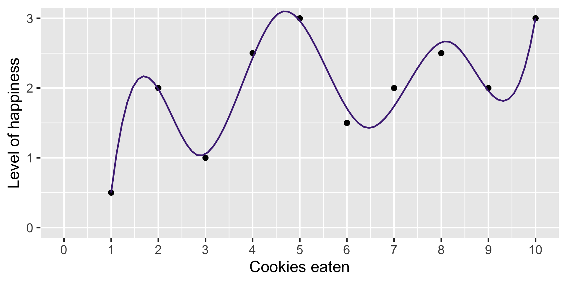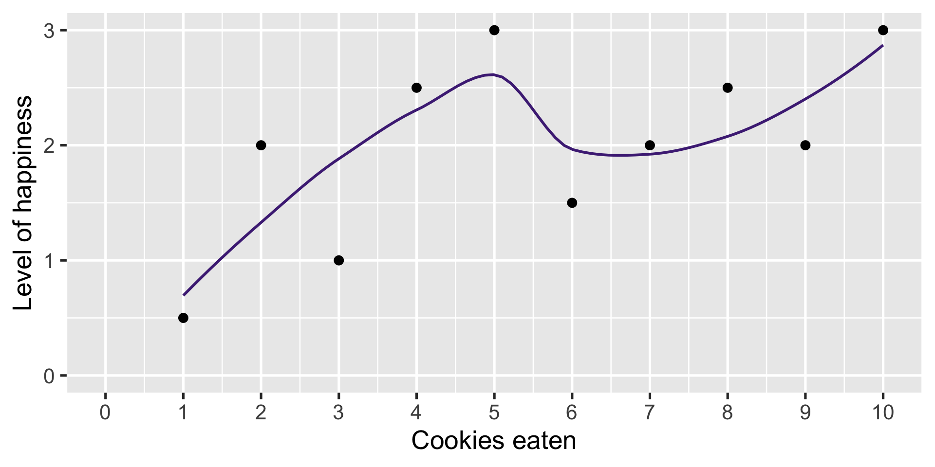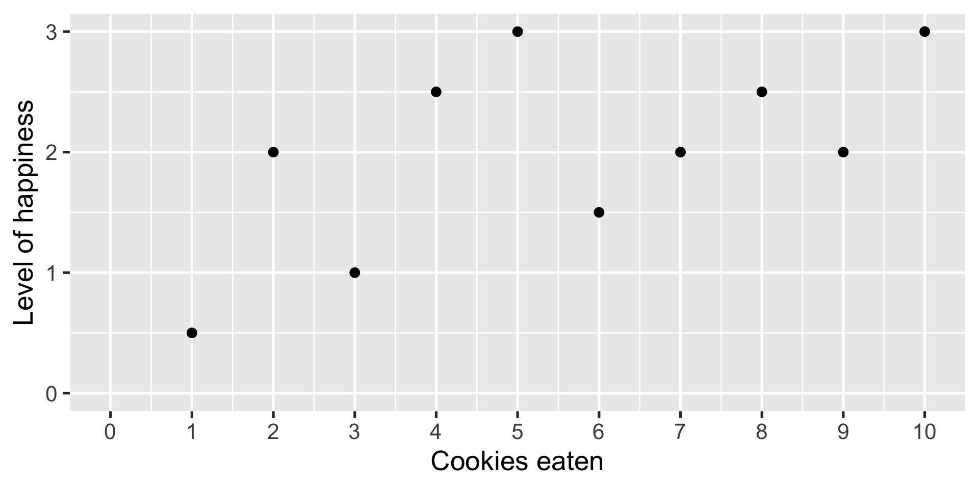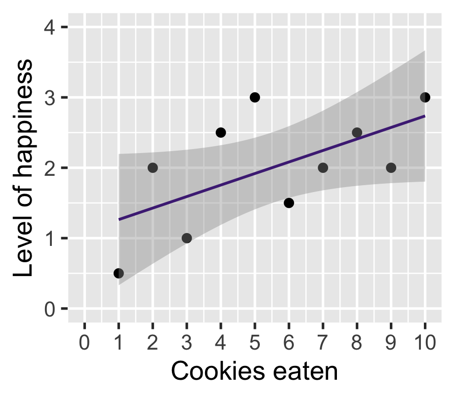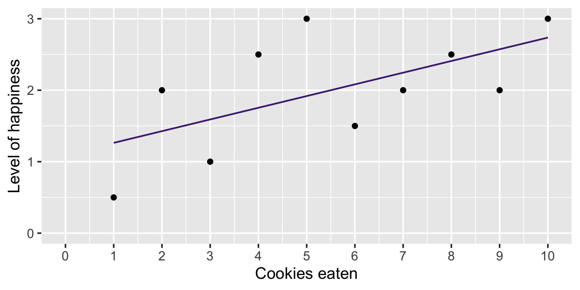 \[ \widehat{\text{happiness}} = \beta_0 + \beta _1 \text{cookies} \]