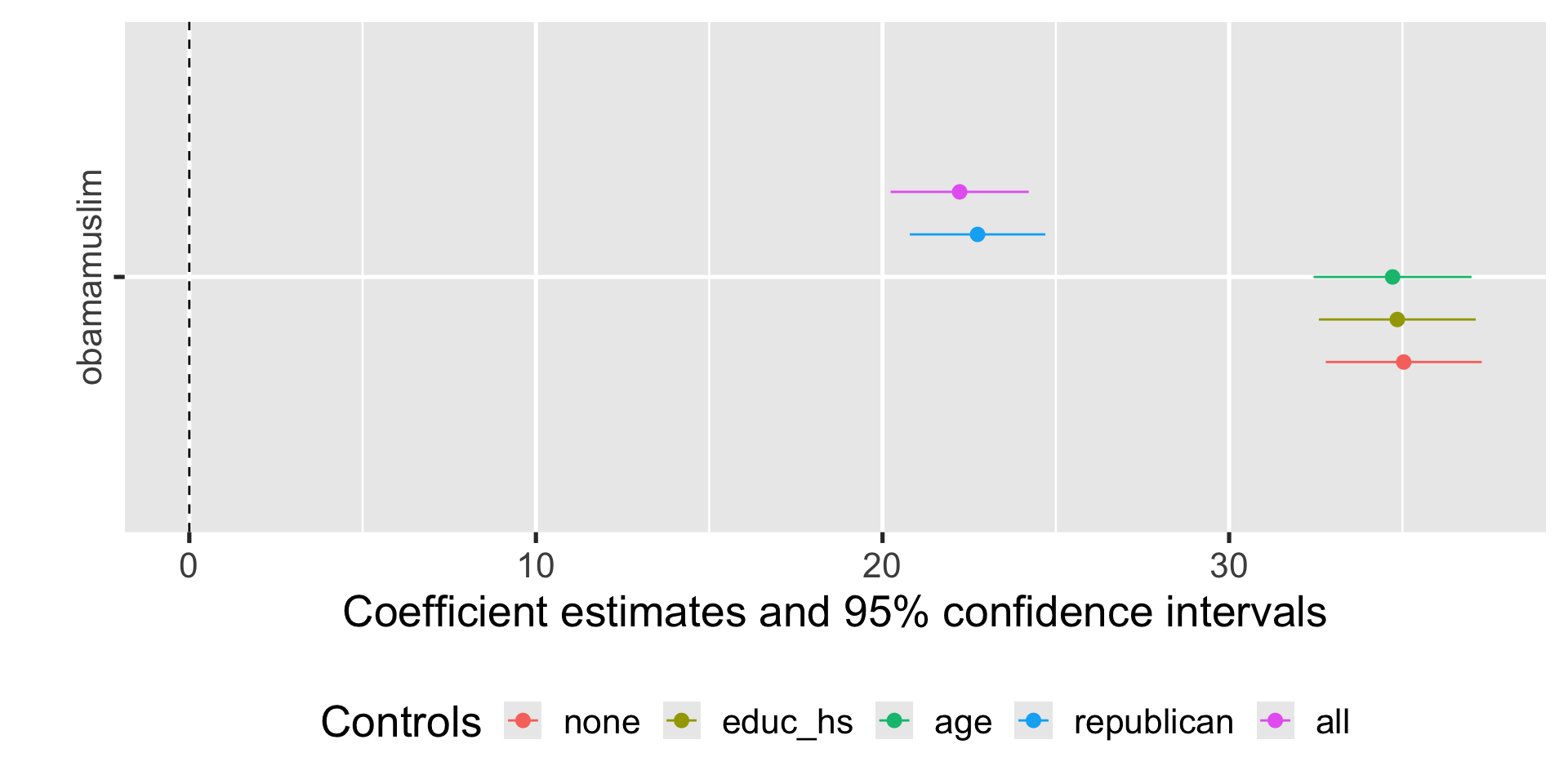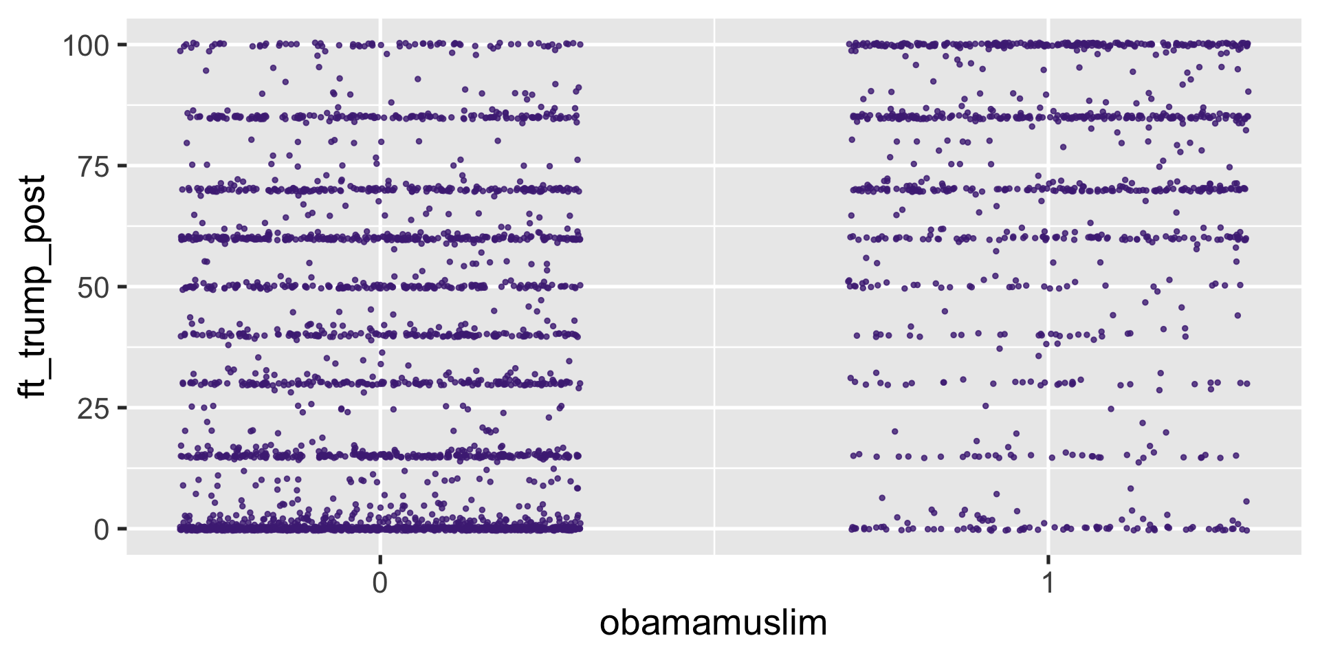 \(\widehat{\texttt{ft_trump_post}} = 20.367 + 22.74 \cdot \texttt{obamamuslim} + 37.53 \cdot \texttt{republican}\)