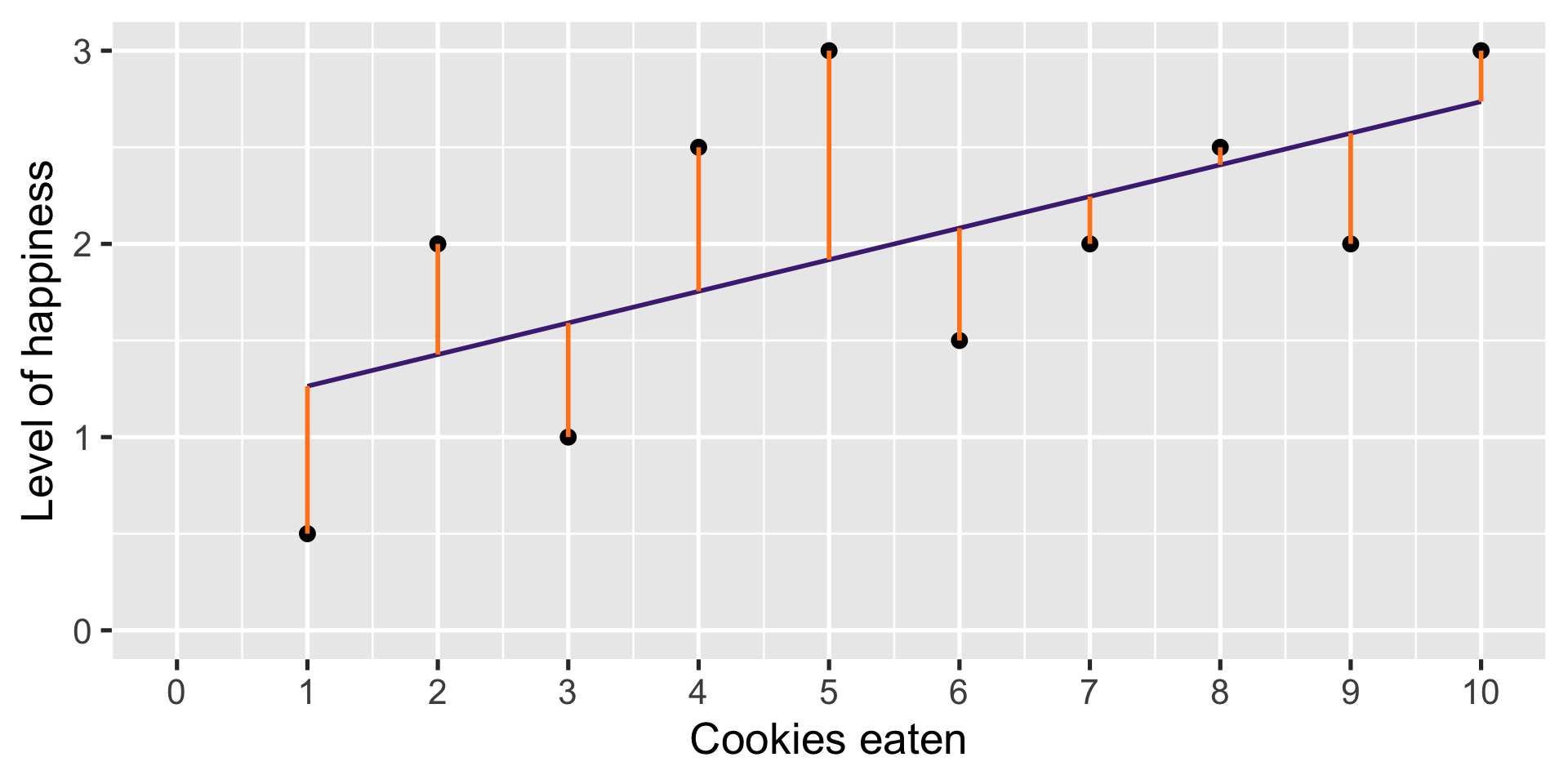 \(\widehat{\text{happiness}} = \beta_0 + \beta_1 \text{cookies}\)